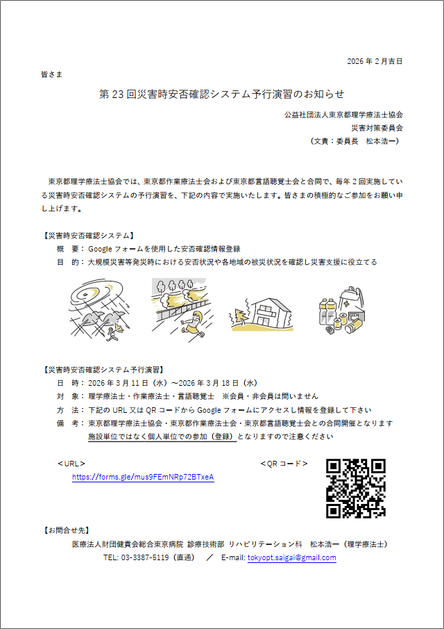 会員の方へMenber 会員の方へのお知らせ 事務局からのお知らせ ライフサポート部からのお知らせ 講習会・研修会・学会のお知らせ ブロック・支部からのお知らせ 都士会学会からのお知らせ 生涯学習制度について 英語論文紹介について 診療・介護報酬について 求人広告 部局委員会担当者用 第23回災害時安否確認システム予行演習のお知らせ