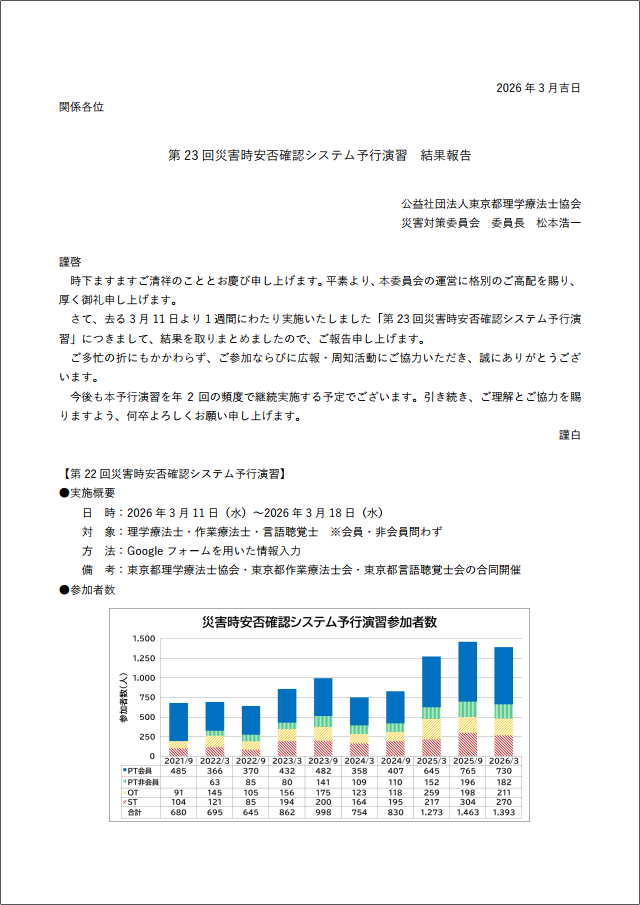 会員の方へMenber 会員の方へのお知らせ 事務局からのお知らせ ライフサポート部からのお知らせ 講習会・研修会・学会のお知らせ ブロック・支部からのお知らせ 都士会学会からのお知らせ 生涯学習制度について 英語論文紹介について 診療・介護報酬について 求人広告 部局委員会担当者用 第23回災害時安否確認システム予行演習 結果報告