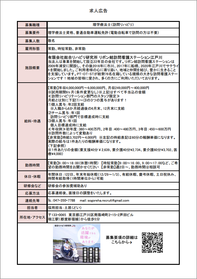 会員の方へMenber 会員の方へのお知らせ 事務局からのお知らせ ライフサポート部からのお知らせ 講習会・研修会・学会のお知らせ ブロック・支部からのお知らせ 都士会学会からのお知らせ 生涯学習制度について 英語論文紹介について 診療・介護報酬について 求人広告 部局委員会担当者用 有限会社総合リハビリ研究所(リボン結訪問看護ステーション江戸川) 有限会社総合リハビリ研究所(リボン結訪問看護ステーション江戸川)【PDF】