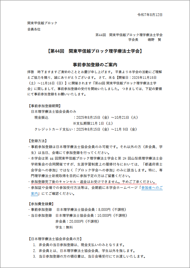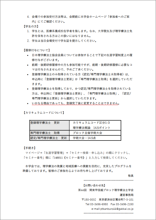 会員の方へMenber 会員の方へのお知らせ 事務局からのお知らせ ライフサポート部からのお知らせ 講習会・研修会・学会のお知らせ ブロック・支部からのお知らせ 都士会学会からのお知らせ 生涯学習制度について 英語論文紹介について 診療・介護報酬について 求人広告 部局委員会担当者用 第44回関東甲信越ブロック理学療法士学会 事前参加登録のご案内