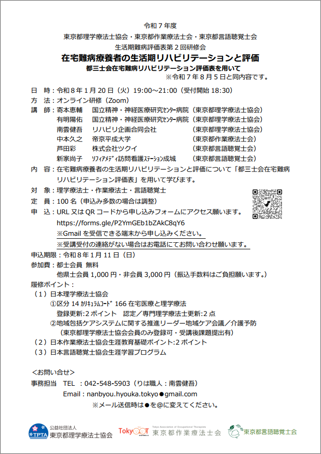 会員の方へMenber 会員の方へのお知らせ 事務局からのお知らせ ライフサポート部からのお知らせ 講習会・研修会・学会のお知らせ ブロック・支部からのお知らせ 都士会学会からのお知らせ 生涯学習制度について 英語論文紹介について 診療・介護報酬について 求人広告 部局委員会担当者用 在宅難病療養者の生活期リハビリテーションと評価都三士会在宅難病リハビリテーション評価表を用いて
