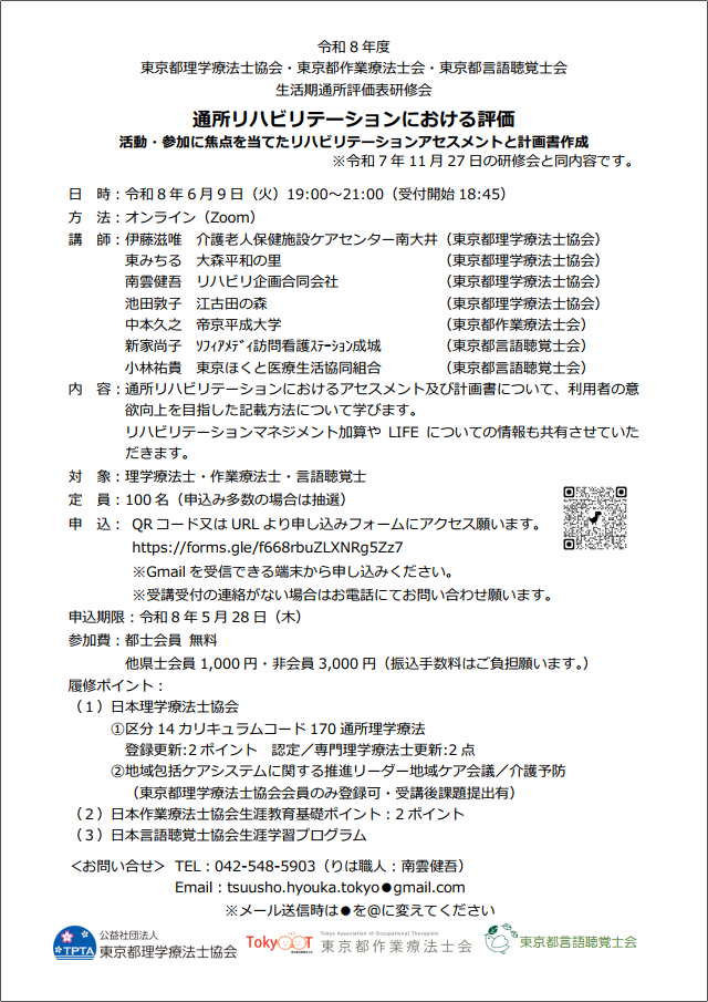 セミナー名称:令和8年度生活期 通所評価表研修会